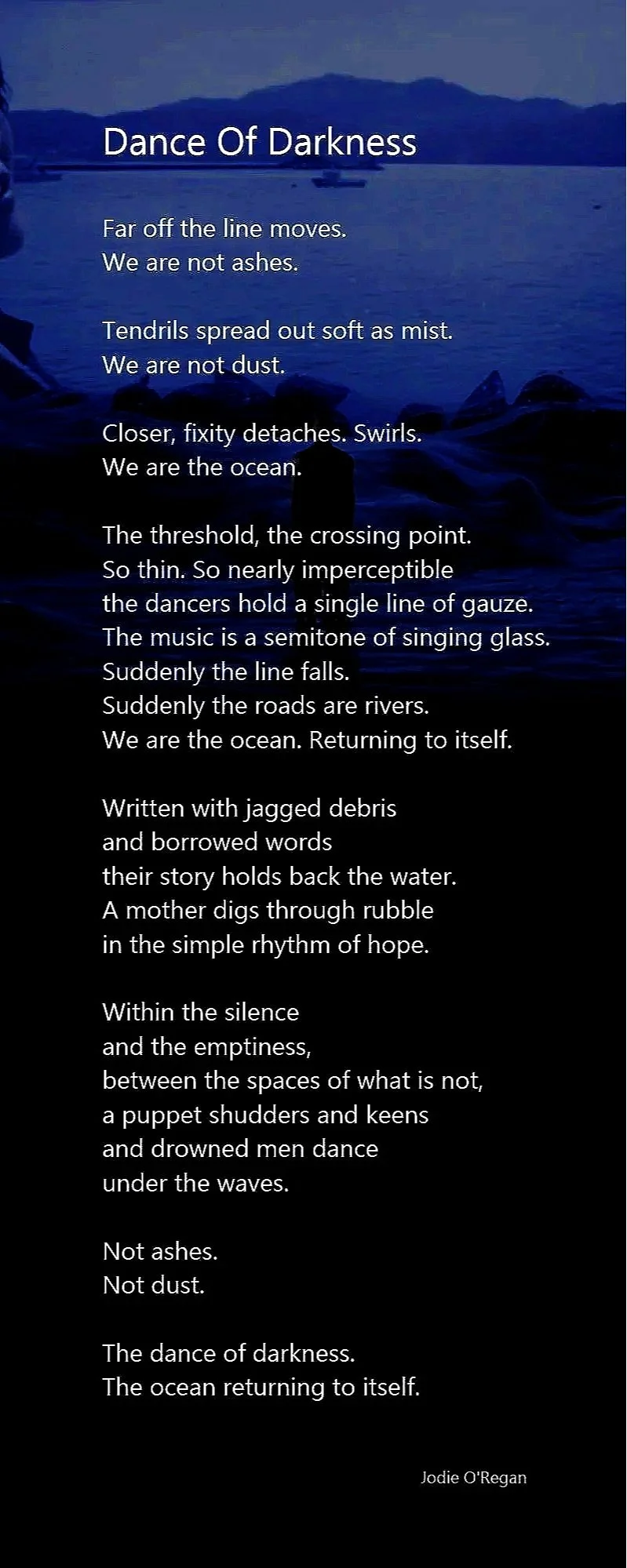 While living in Nashville, I was part of a cross art project between the production company OZ and the Nashville Writers’ Centre. Oz hosted FALLING OUT by Phantom Limb Company an extraordinary work incorporating dance, music, puppetry, and screened footage, exploring the tragic 2011 Japanese tsunami. My brief was to write a poem in response to this work. The Japanese dance style in the work is known as the ‘the dance of darkness’.